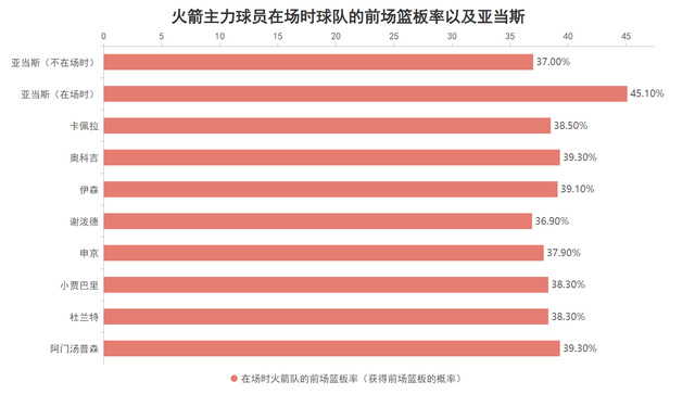 那么为什么火箭一度跌落到附加赛区域了呢?最关键的一点是篮板怪兽亚当斯的受伤,当亚当斯在场对比不在场时,火箭的前场篮板率会从37%飙升到45.1%,而亚当斯在场时45.1%的篮板率更是断档式领跑火箭全队,当亚当斯倒下后火箭的前场篮板能力大幅度下降但一直以来的进攻模式却一时间没有转变过来,再加上进攻过分依赖杜兰特而对手又包夹杜兰特导致火箭的进攻全面崩盘。
