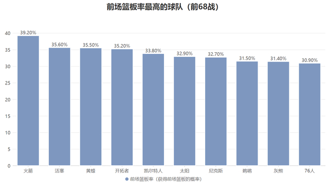 火箭本赛季前中期的赢球公式是两个字投抢,很多情况是依靠着强大的前场篮板能力获得出手数的领先再以并不高的得分效率获胜,赛季的前68场比赛火箭的前场篮板率高居联盟第一的39.2%,这意味着当火箭进攻出手不中时有39.2%的篮板球都属于火箭队。