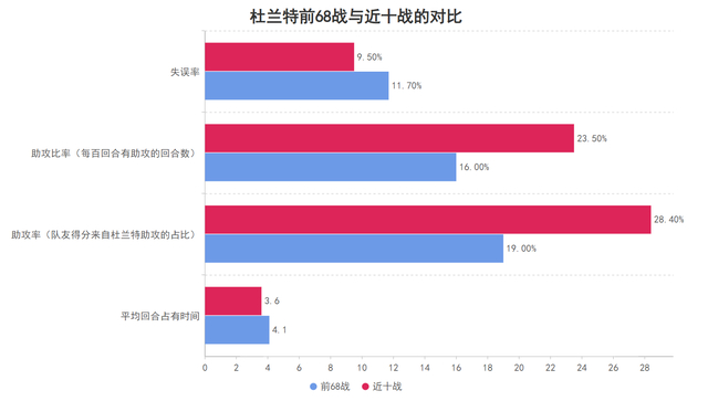 策略改变的成功从杜兰特个人的变化就可以得到体现,杜兰特近十战的平均回合占有时间从前68战的4.1秒下降到了3.6秒,同时杜兰特的助攻率与助攻比率均有提升失误率又有下降,这意味着他通过更舒服接球+快速处理球减低了对手针对性防守的影响,虽然前场篮板能力无法恢复,但火箭通过改变进攻战术解放了杜兰特,杜兰特也用个人能力回馈了火箭。